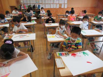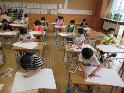 図工の学習では、国語で学習した「スイミー」のお話を思い出し、絵に描きました。虹色のゼリーのようなくらげや、ブルドーザーみたいないせえび等、どんな色や形なのか、想像を膨らませながら描きました。