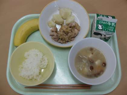 ごはん 牛乳 あっさりチキン こふきいも なめこじる バナナ