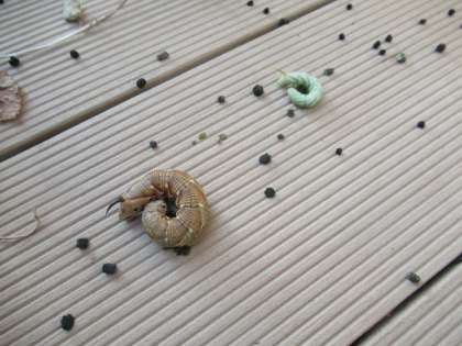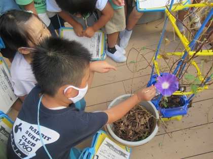 5月からずっと大切に育ててきたあさがおの鉢の周りに、種と同じくらいの大きさの物体を発見しました。「これは、ふんだ!」ということは……?あさがおの茎に何かいるのでは、と探した子供が叫びました。「いたー!!」とても大きい芋虫(蛾の幼虫)でした。女の子の中には、泣き出す子供も出始めました。そんな中、大切なあさがおを守ろうと、割り箸で茎からはずして回る男の子がいました。たくさんの芋虫からあさがおを守ったヒーローに、「ありがとう。次は、がんばってみるね」とちょっぴり勇気をもらっていました。