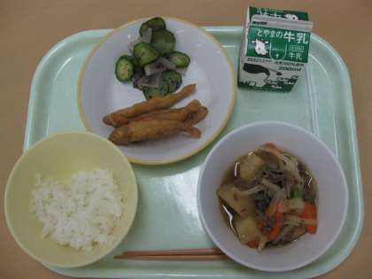 ごはん 牛乳 わかさぎのフリッター ばいにくあえ にくじゃが
