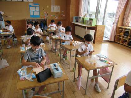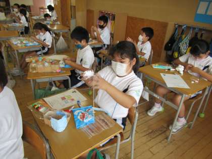 図画工作科の学習で、小物入れを作っています。家で集めた空き容器を組み合わせ、色を付けた紙粘土で飾ります。思い通りの色になるように絵の具の量を調整したり、凹凸を無くそうと指で紙粘土を丁寧に伸ばしたりするなど、一人一人が工夫しながら作っています。完成が楽しみです。