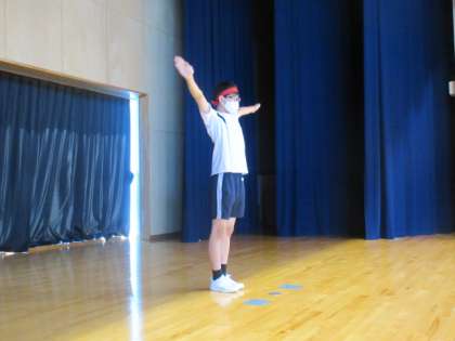 指揮者を手本にラジオ体操の練習をしました。ラジオ体操でも学校の手本になれるように一つ一つの体操の動きを確認しました。運動会本番に向けて、6年生みんなでがんばっています。