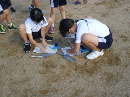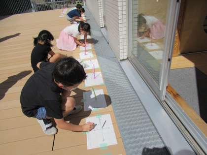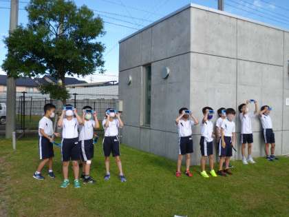 理科の学習で、時間によって影の向きがどのように変わっていくのかを観察しました。また、遮光プレートを使って太陽の観察もしました。子供たちは「見て!まん丸だよ!」「雲が動いて太陽を隠したら、影がなくなってしまったよ!」と気付いたことを交流していました。