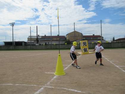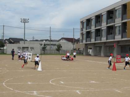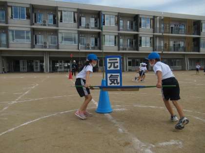 運動会の団体競技、「元気でワッショイ!」の練習をしました。元気と書いてある箱をおみこしに乗せ、落とさないように協力しながら二人で運びます。子供たちは、ペアの友達と声をかけ合いながら、上手に運べるようになってきました。コースの中心に置いてあるカラーコーンの周りを回るところでは、どうすれば早く回ることができるか考え、工夫しています。どの団も、一生懸命練習に取り組みました。