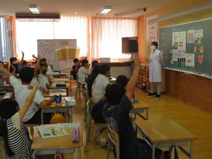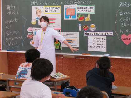 家庭科の学習では、自分の生活を見直しています。今日は、小林学校栄養職員さんから朝食のはたらきを学びました。自分の朝の時間の使い方や朝食の食べる量について見直している子供たちでした。