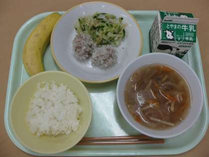 ごはん 牛乳 チンズワンズ あわせあえ くきわかめスープ バナナ