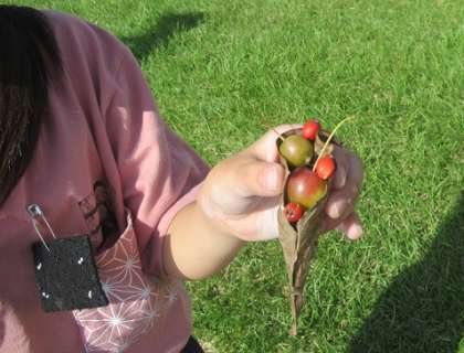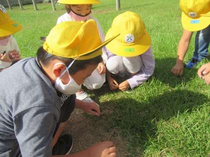 さわやかな秋空になり、子供たちと校庭を散策しました。赤く色付いた葉や実を見付けたり、元気に跳びはねるコオロギ等の虫を捕まえたりしました。これまで虫が苦手だった子供が、得意な様子で手の中に入れている友達を見て、自分も触ってみたいと勇気を出して捕まえている姿が見られました。「初めてコオロギを自分で捕まえることができたよ」とうれしそうに見せにきたときは、みんなで一緒に喜びました。