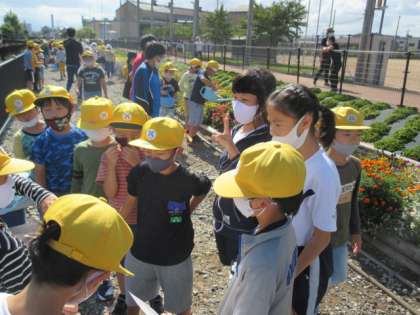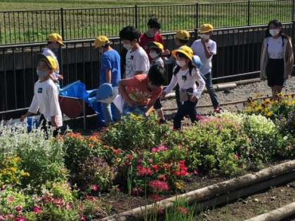 3年3組のオープン花畑がありました。自分たちが育てた花の説明や花に関するクイズを出したり、下学年と一緒に水やり体験を行ったりしました。花畑を見にきた他の学年の人たちの笑顔を見て、達成感を味わうことができました。