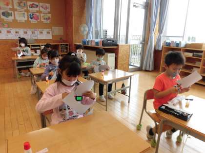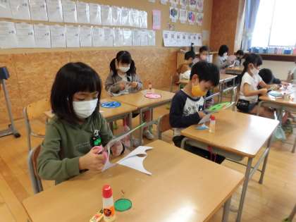 今日は学習発表会で使用するお面をつくりました。自分好きな色で顔の色をぬったり、表情を描いたりしながら素敵なお面に仕上げました。
