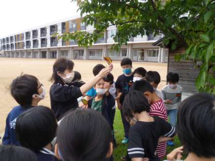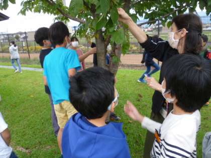 理科ではグラウンドにある木を一つ選び、年間通して観察しています。最近涼しくなり、今、木の様子はどうなっているのかをみんなで見に行きました。子供たちは枝や葉を見て、「色が変わっているよ」「枝から芽が出ているね」と気付いたことを話していました。