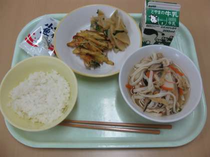 【今日の献立】 ごはん 牛乳 かしわうどん えごまいりかきあげ かふうあえ あじつけこざかな