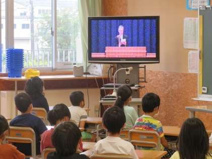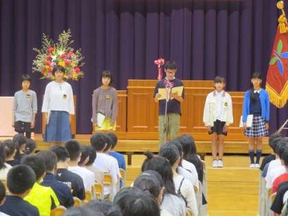 10月13日に創校10周年記念式を行いました。5・6年生が体育館に集まり、1〜4年生は各教室でテレビ放送を視聴しながら式に参加しました。校長先生のお話や来賓の方のお話、6年生の代表児童の発表を聞きながら、子供たちにとって、創校までの歩みや誕生からの10年の歴史を振り返り、これからの新庄北小学校をよりよい学校にしていこうと気持ちを高める機会となりました。
