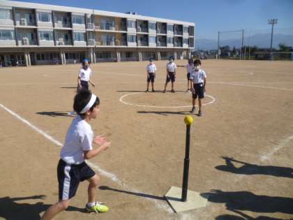 体育科ではハンドベースボールに取り組んでいます。手でボールを打ったら、塁に向かって思いっきり走ります。子供たちは一点でも多く得点しようと、猛ダッシュしていました。また、今日の学習を通して、自分たちの課題が見付かったようです。今後どのような作戦を立てたり練習に取り組んだりすると、多く得点することができるでしょうか。チームでの話合いを通して、学習を深めていきます。