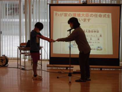 今日はとやま環境財団から職員の方にお越しいただき、「とやま環境チャレンジ10教室」を行いました。子供たちは、これまで総合的な学習の時間で学習してきたことを思い出しながらお話を聞いていました。イラストを使った間違い探しでは、「テレビのつけっぱなしもったいない」「ごみは水を切ってから出したらよい」と、環境のためにできることを見つけました。最後に、子供たちには任命書が手渡され、環境を守るためにできることをたくさんしていこうと意欲を高めていました。