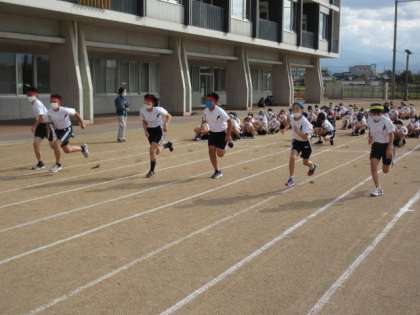今日は、100m走の記録をとりました。速く走るために学習したことを意識しながら、力強く走る姿がたくさん見られました。