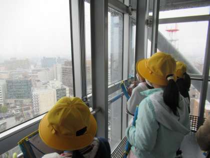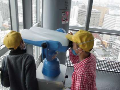 校外学習で、富山市役所の展望塔に行きました。地上70mの高さから富山市の様子を見ることで、「富山駅の周りには高いビルがたくさんあるね」「自分の家の周りと違って、あまり家が建っていないね」と土地利用の特徴について気付くことができました。