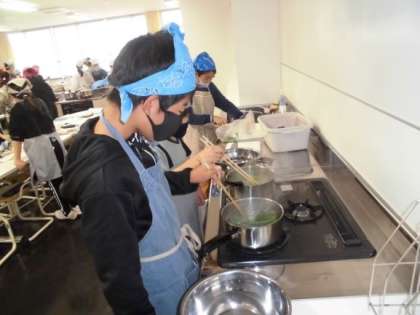 今日は家庭科で「ほうれん草のおひたし」を作りました。ガスコンロや包丁の使い方に気を付け、安全に調理をしました。野菜が苦手な子も「おいしいね。」と笑顔で話していました。