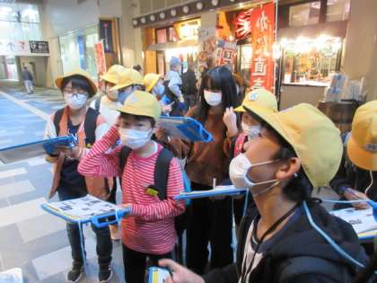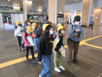 しおりにある写真を探すために富山駅構内をを見学しました。新しくなった駅を散策しながらクイズに答えていました。友達と協力しながら活動に取り組む姿がたくさん見られました。