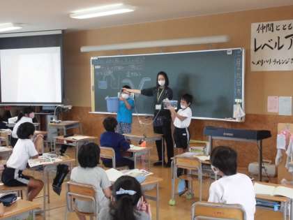社会科の学習では、郷土の発展に尽くした先人の働きについて学んでいます。今日は、荒れ地に用水を引くために使われた「サイフォンの原理」を、バケツとホースを使って確かめました。高い方のバケツから低い方のバケツへ水が流れていく様子を見て、子供たちは「すごい」と歓声をあげていました。