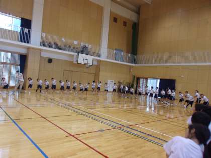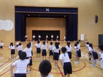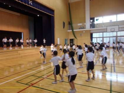 今日の体育では、学習発表会に向けて練習している各チームのダンスを、全員で踊ってみました。以前から、他チームのダンスにも興味をもっていた子供たちは、前に立つお手本の友達を見ながら楽しそうにダンスを踊っていました。最後はみんなで大きな輪になって踊りました。