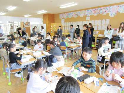 今日は学習参観がありました。生活科の学習で、動くおもちゃをみんなで作りました。牛乳パックと輪ゴムを使って、「びっくりかえる」を作ってとばしました。高くとばす工夫や、面白い遊び方を考えながら、楽しく作ることができました。