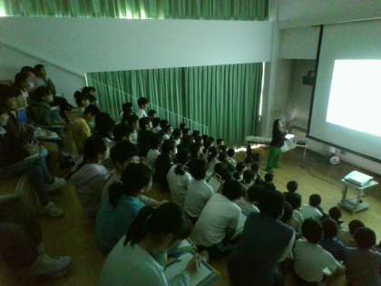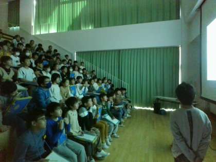 1学期に保護者の方にも協力してもらって取り組んだ「とやま環境チャレンジ10」の結果をお聞きしました。みんなの小さなエコ活動が集まると、たくさんの温室効果ガスを減らすことができたと分かり、子供たちも「おー!」と喜んでいる様子でした。今後も自分たちにできる取り組みを続けていってほしいと思います。