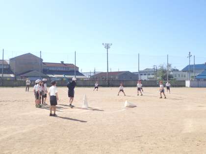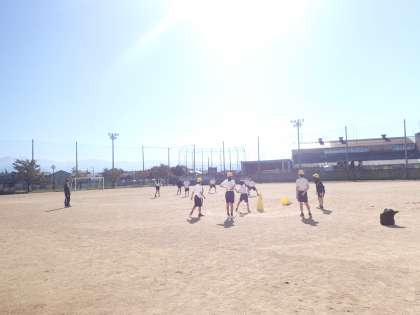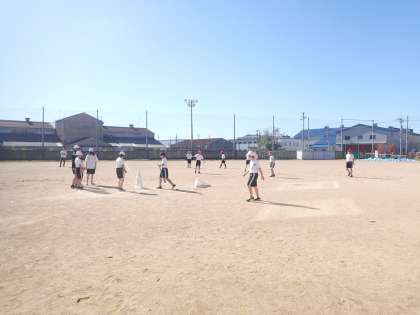 青空が見られ気持ちよい天気の中、体育ができました。試合では、「もっとさがれよ」「おもいきり打っていいよ」などチームで声をかけあう姿が見られました。