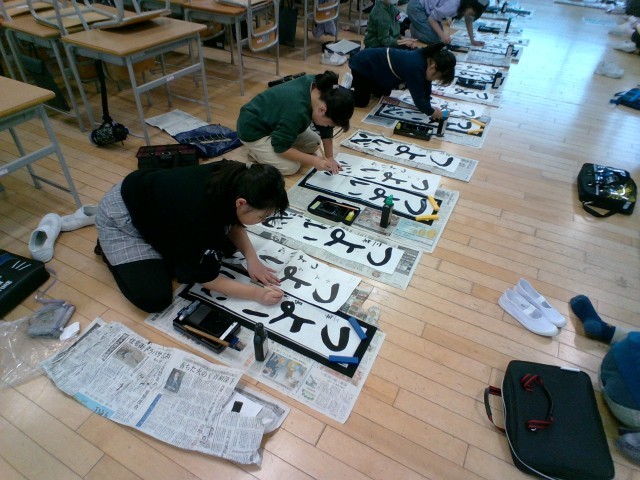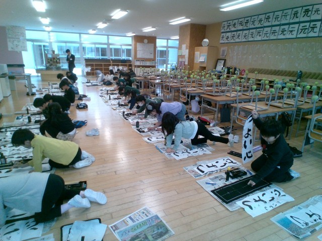 書初大会の様子です。冬休みの練習の成果を発揮しようと、子供たちは集中して、取り組んでいました。よりよい字を書くために、一筆一筆、丁寧に書き上げることができました。