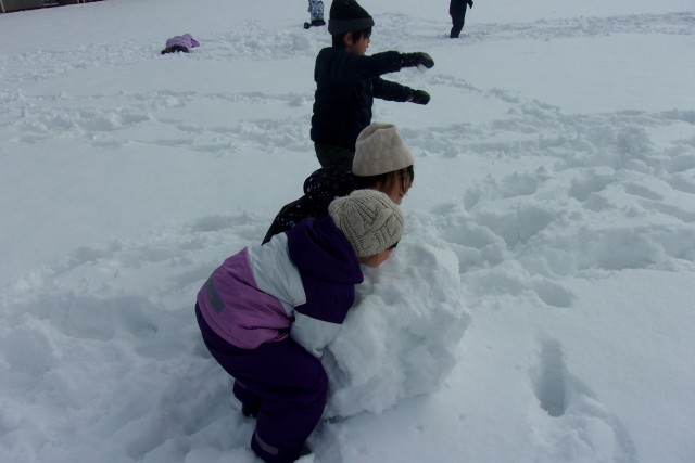 大きな雪玉をつくっている様子です。