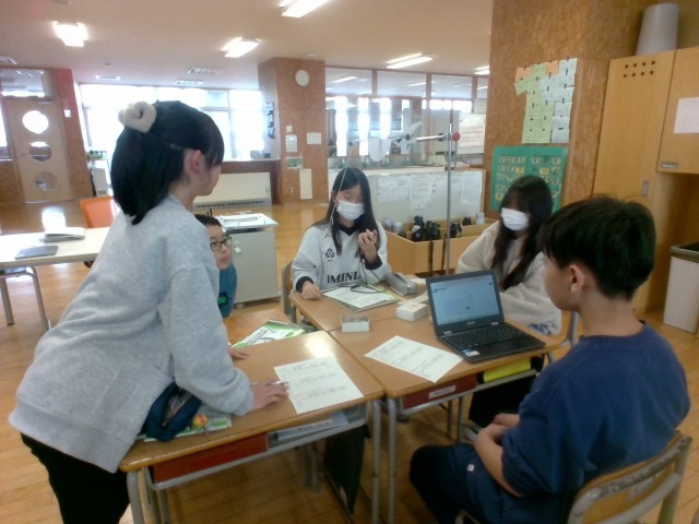 5年生は、ふりこのきまりについて学習しています。ふりこの動きが変化する原因を見つけるために、ひもの長さやおもりの重さ、ふれはば等を変えて実験しています。往復する数を数える人、平均値を計算する人などグループの中で役割分担を決めて行っています。