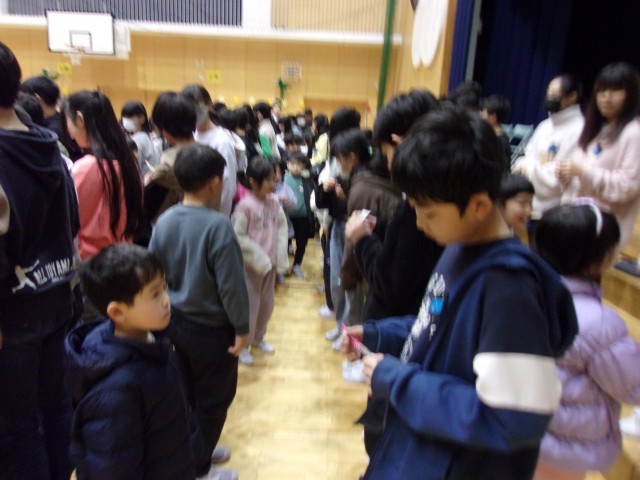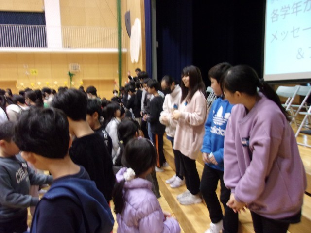 6年生を祝う会がありました。1年生は、6年生と手をつないで入場したりプレゼントを渡したりしました。お世話になった6年生に感謝の気持ちを伝えることができました。