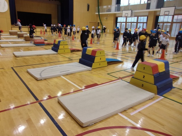 体育では跳び箱運動に取り組みました。大きさや置き方の違う跳び箱をいくつも用意しました。自分のしたい跳び方によって場所を選べるようにすることで、子供たちは考えながら場所を選択し、進んで練習に取り組むことができました。