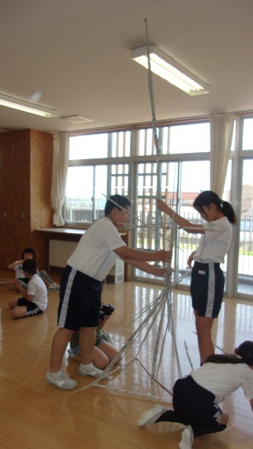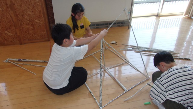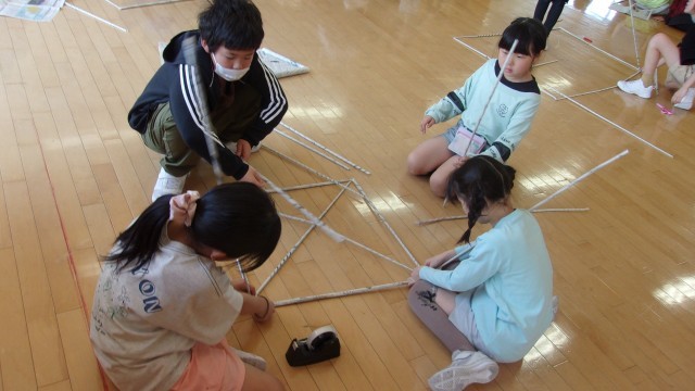 図工の学習で、新聞紙を筒状にし、組み合わせ方を考えながら様々な形をつくりました。班の友達と協力し、どんどんつないでいきました。子供たちは、「自分の身長より高くなったよ」や「私たちのお家ができたよ」などと、笑顔で活動に取り組んでいました。