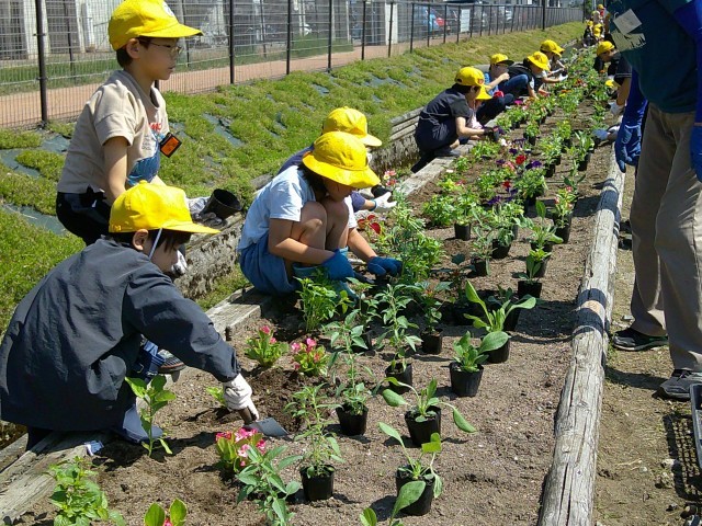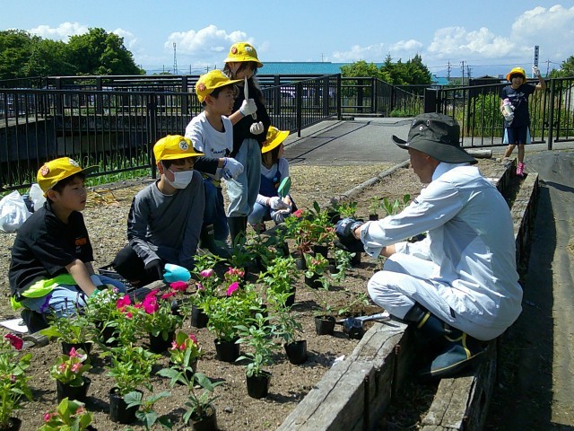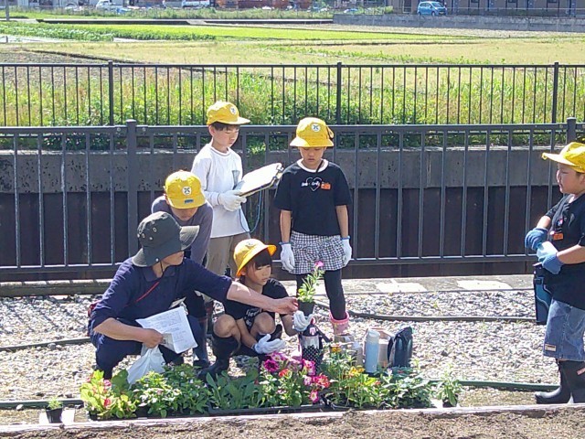 デザイン通りに配置した花をひとつひとつ丁寧に植えました。子供たちは「これから水やりをするのが楽しみだな」「最優秀賞をとりたいな」など、思いを膨らませながら取り組んでいました。