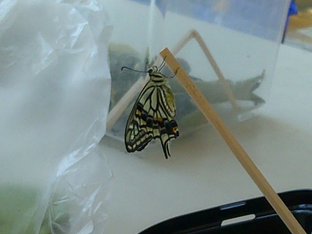 理科の学習で観察してたアゲハチョウが、ついにさなぎから成虫になりました。