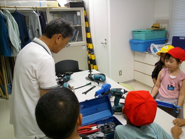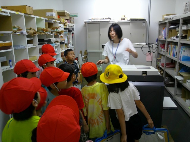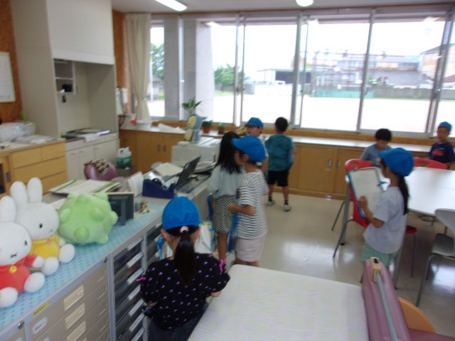 3回目の学校探検では、校長室、保健室、給食室、用務員室、職員室の5つの場所にそれぞれグループに分かれて探検に行きました。給食室では大きなお鍋やしゃもじを見てびっくりしたり、お仕事のことや見つけたことについて質問したりしました。学校にある物をたくさん見つけたり、知ったりすることで、学校について更に詳しくなった1年生でした。