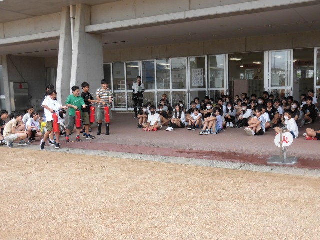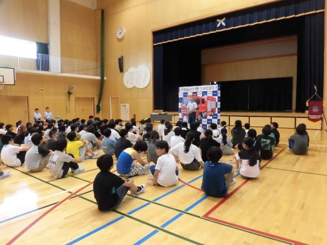 少年消防クラブ(BFC)のバッジ授与式が行われ、児童が正式にクラブの一員となりました。式の後は、消防署の方から火災の原因や火災時の対応についてのお話をいただきました。子どもたちは、日頃から火の用心を心がける大切さを学びました。実際に消火器を使った体験も行いました。今後も地域の安全を守る意識を高めていきたいと思います。