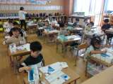 図工の学習で、初めて水彩を使いました。パレットや筆洗などの使い方を学び、水で薄...