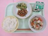 今日の給食は、ごはん、牛乳、小魚入りフライビーンズ、あわせ和え、はくさいなべで...