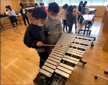 曲中に出てくる魔法の音を自分たちで考えています。 曲の雰囲気と楽器の特徴を考えな...