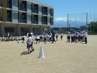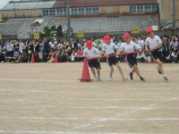 4年生は、台風の目をがんばりました。4人で力を合わせて、コーンを回りました。