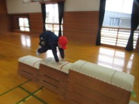 「跳び箱を使った運動遊び」をしています。遊びながら「両腕で全身を支える感覚」を...