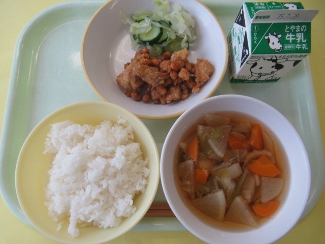 22日(月)今日の献立 公開日 2025/07/22 更新日 2025/07/22 給食室 ・ごはん ・牛乳 ・きざみ和え・鶏肉と大豆の甘からめ ・つみれ汁※11時50分、検食終了。今日も美味しく出来上がっています。