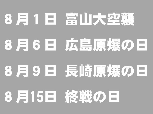 毎年8月1日(富山市民感謝と誓いのつどい)から15日(お盆)は、「戦争と平和」について、自分なりに思いをめぐらせる期間です。
