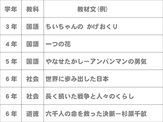 上の学年の人でも、3年国語「ちいちゃんのかげおくり」や4年国語「一つの花」などを読み返してみましょう。きっと、以前の自分とは違った感想をもつことでしょう。お家の人の感想を聞いてみるのもいいですね。