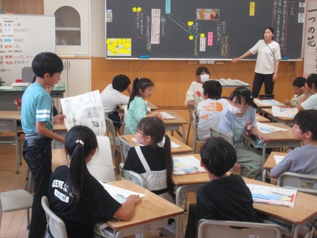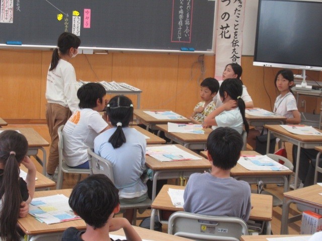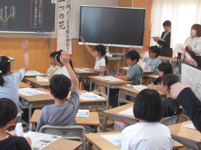この機会に、教科書に載っている、下記の教材文などを読み、「平和」について自分なりに考えてみることは、とても意味のあることです。「勉強」などと考えずに読み進めてみましょう。画像は、4年生の皆さんが「一つの花」を熱心に学習している様子です(6月)。