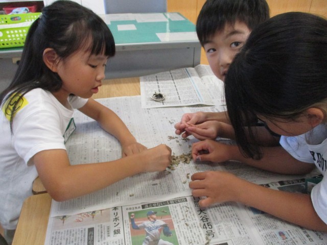 3年生は、理科の学習で、春から育ててきたヒマワリの種の数をグループで数えました。「家で育てているヒマワリも大きく育ったよ」「予想よりもたくさんとれてうれしい」などと言いながら活動しました。