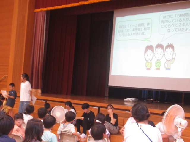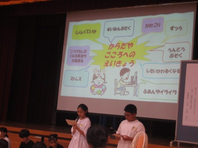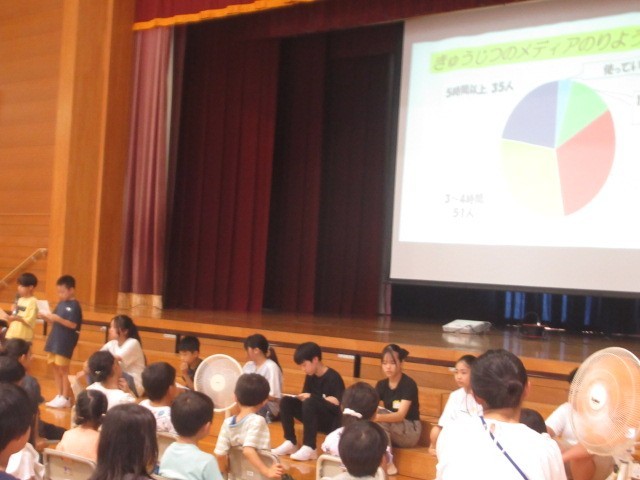 今回のテーマは「メディアと上手に付き合おう」です。まず、生活委員会の皆さんが、三成っ子へのアンケート結果などを発表してくれました。