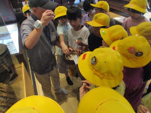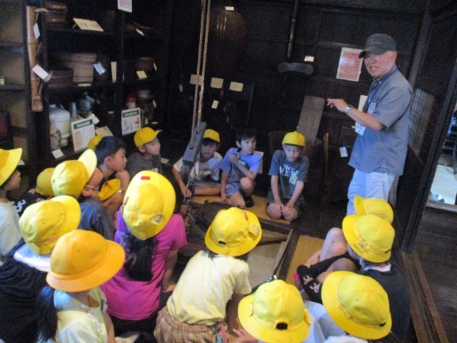 2グループは、昼食後、富山市民俗民芸村に行きました。民俗資料館では、2階に上がり、合掌造りの様子や昔の道具について説明を聞きました。「この道具はどうやって使うんですか。」「このわらじは、どうやって作るんですか。」など質問したり、洗濯板や昔のアイロン、電話機などを見たりしました。合掌館では、囲炉裏を囲んで昔の家の造りについて説明を聞きました。太くて立派な柱を眺めたり、藁ぶき屋根の仕組みについて熱心に聞いたりしていました。