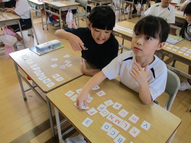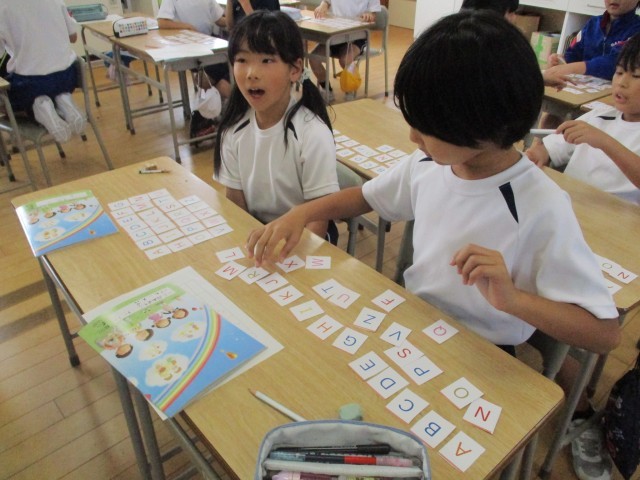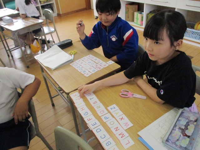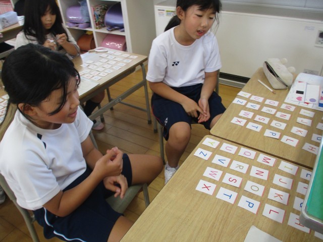 3年生は、外国語でアルファベットの学習をしています。アルファベットのカードを、ABCDEF・・・と声に出しながら机の上に並べました。その後、隣の友達とゲームをしました。順番が入れ替わったカードを見て、元の正しい順番に並び替えるゲームです。子供たちは、黒板の順番に書かれたアルファベットを見たり、順番通りに声に出したりして、正しく並び替えて楽しんでいました。